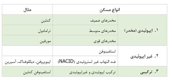 داروهای مسکن و ضد درد به سه دسته اصلی تقسیم بندی می شوند که در جدول زیر نشان داده شده است.