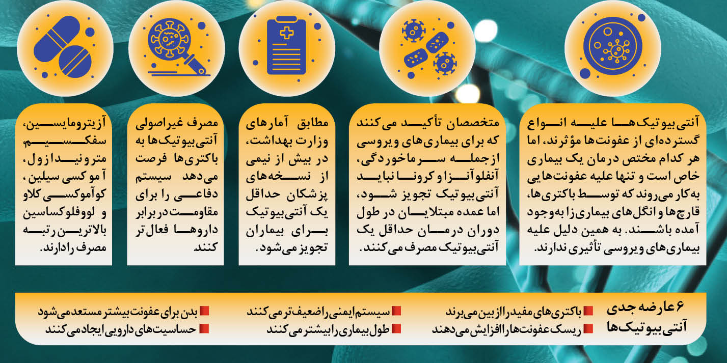 چه باید کرد: متخصصان تأکید می‌کنند که برای جلوگیری از افزایش و مصرف خودسرانه آنتی‌بیوتیک‌ها، مردم باید احساس مسئولیت کنند. انتظارات بیماران و اصرار به تجویز این داروها در نسخه‌ها هم کاهش داشته باشد. در این‌باره همچنین ضرورت دارد مردم آموزش ببینند که هر بیماری نیاز به دارو به‌ویژه آنتی‌بیوتیک ندارد.